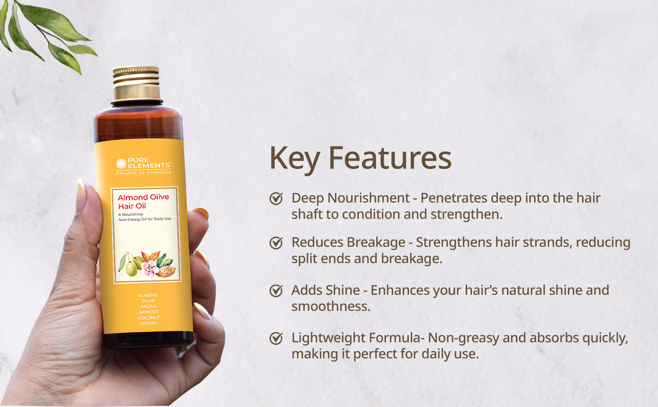 Pure Elements – Almond Olive Hair Oil is a combination of six precious oils for hair care known for the centuries as the best friends of hair. This carefully prepared blend of cold pressed pure oils of Almond & Olive are infused with pure Moroccan Argan Oil which deeply nourishes hair roots and makes hair softer and stronger. This effect is further enhanced with Apricot Kernel, Jojoba and Coconut Oil. It adds natural shine to dull and lifeless hair.