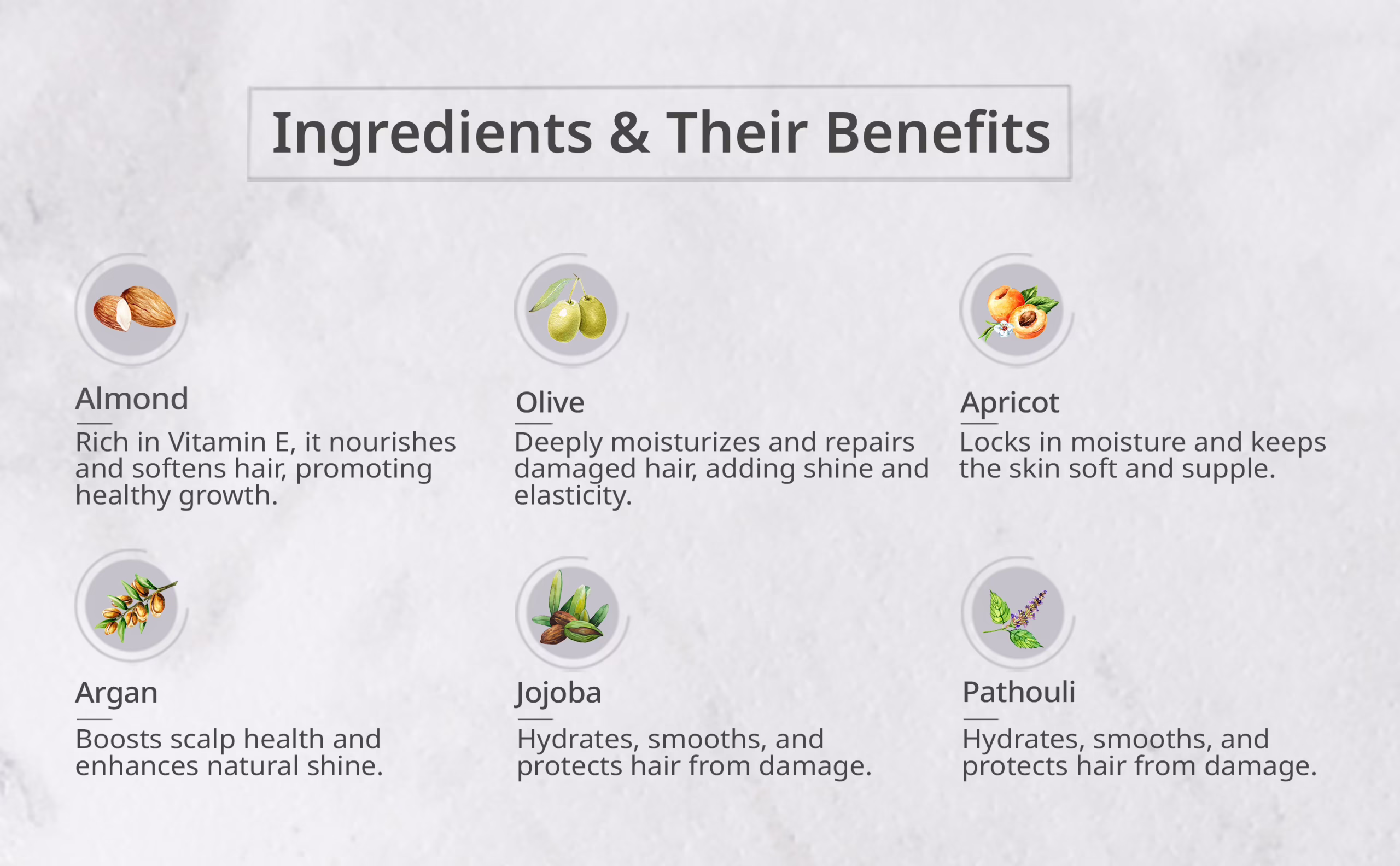 Cold Pressed Pure Almond Oil, Olive Oil, Apricot Kernel Oil, Moroccan Argan Oil, Jojoba Oil, Coconut Oil, Pure Essential Oil of Patchouli