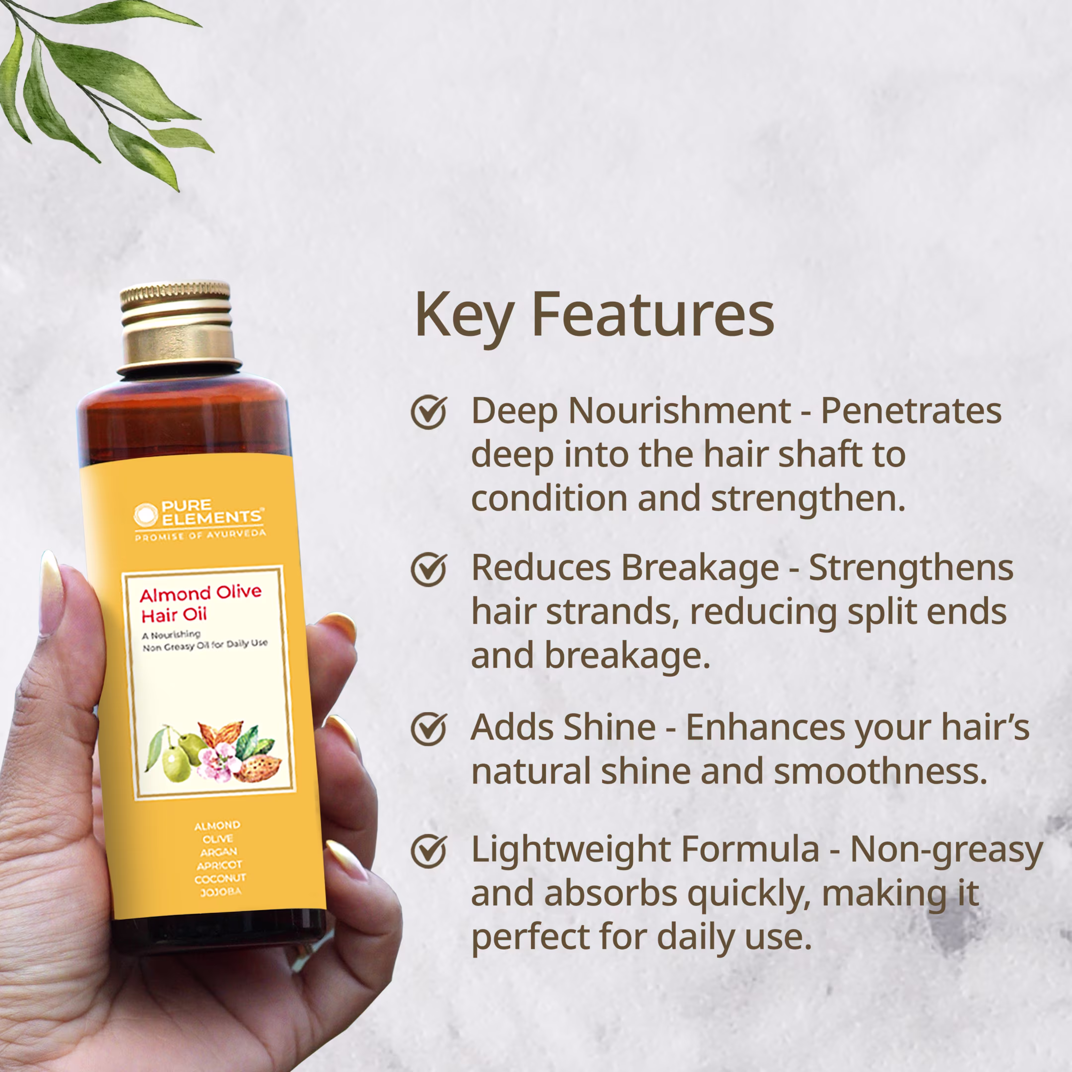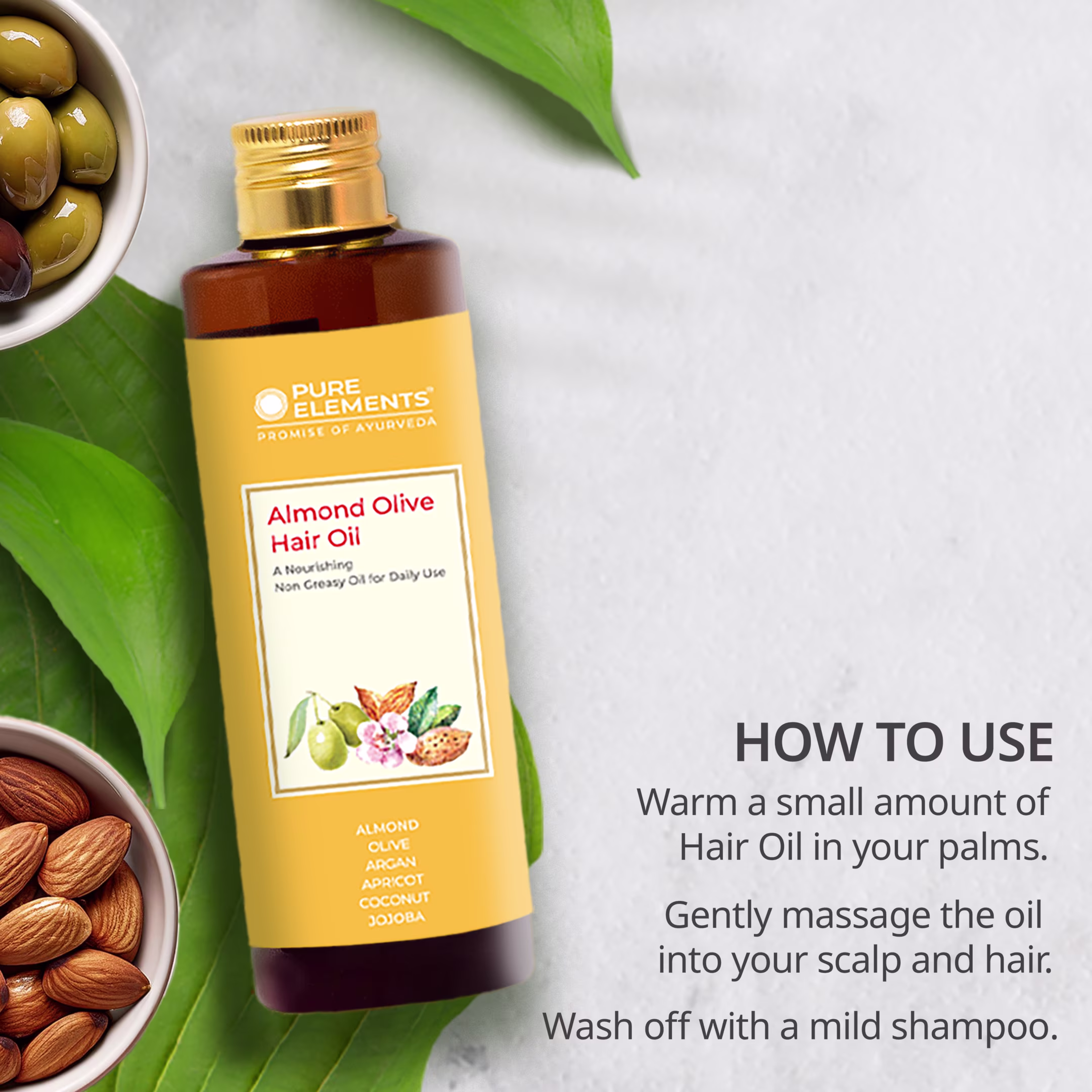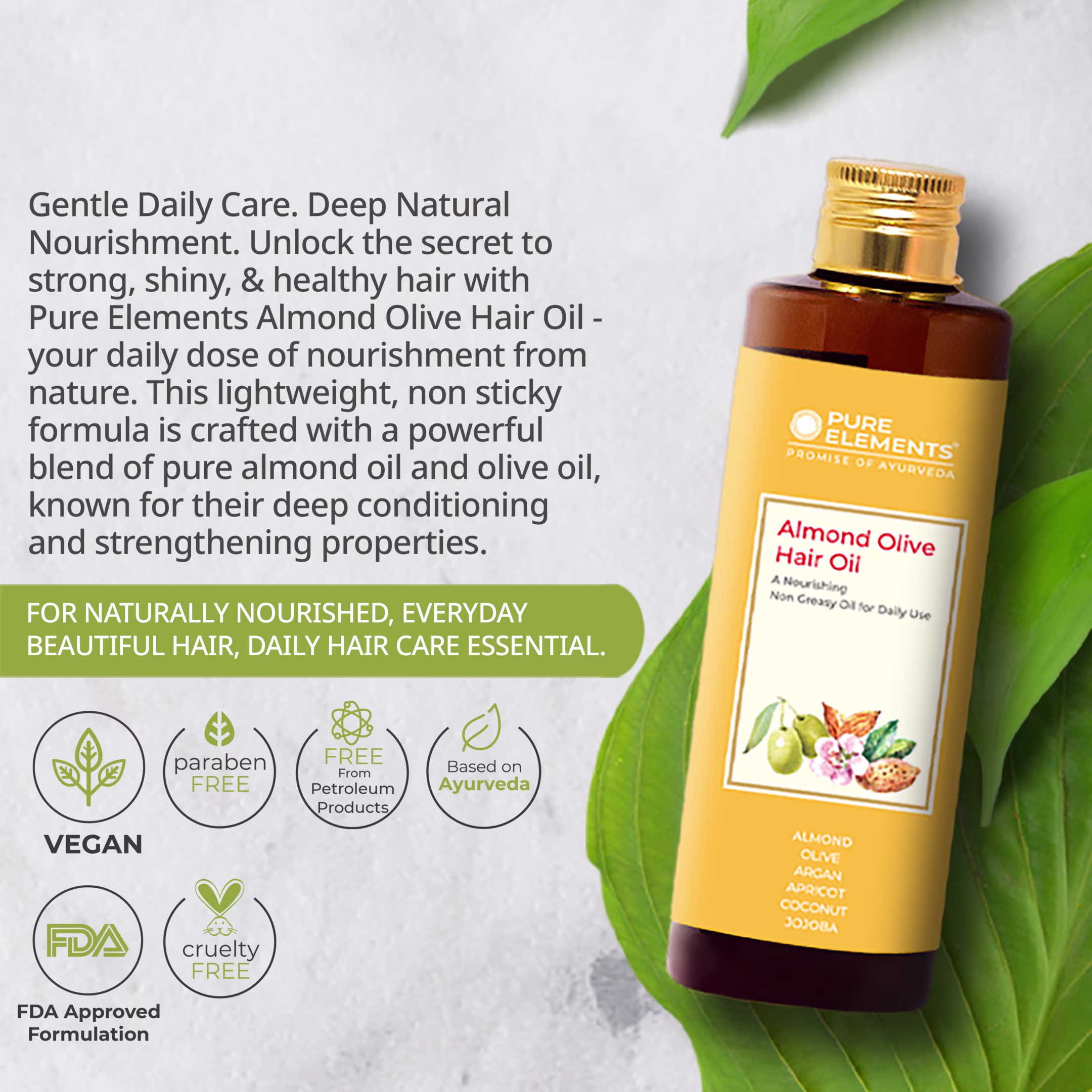 Pure Elements – Almond Olive Hair Oil is a combination of six precious oils for hair care known for the centuries as the best friends of hair. This carefully prepared blend of cold pressed pure oils of Almond & Olive are infused with pure Moroccan Argan Oil which deeply nourishes hair roots and makes hair softer and stronger. This effect is further enhanced with Apricot Kernel, Jojoba and Coconut Oil. It adds natural shine to dull and lifeless hair.