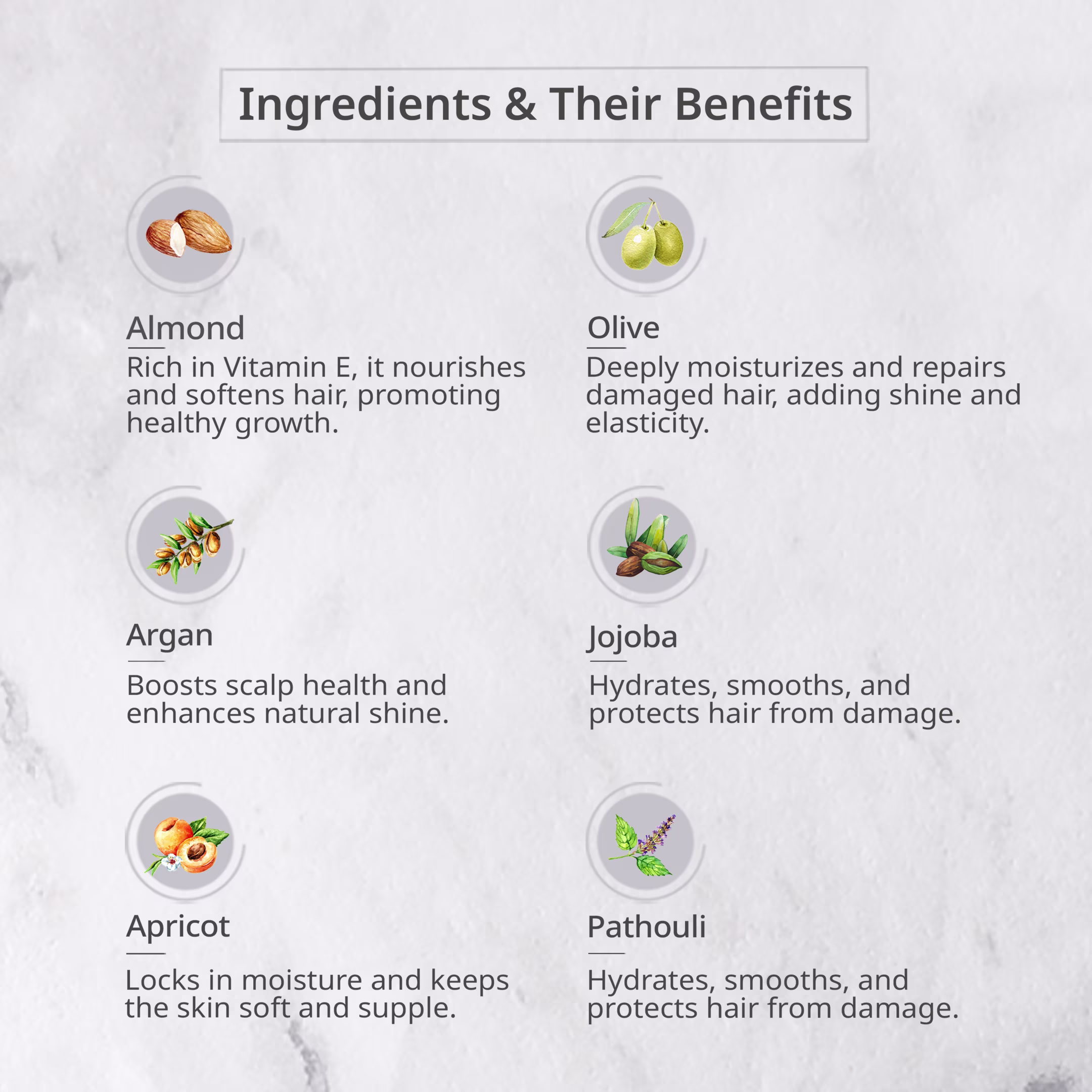 Cold Pressed Pure Almond Oil, Olive Oil, Apricot Kernel Oil, Moroccan Argan Oil, Jojoba Oil, Coconut Oil, Pure Essential Oil of Patchouli
