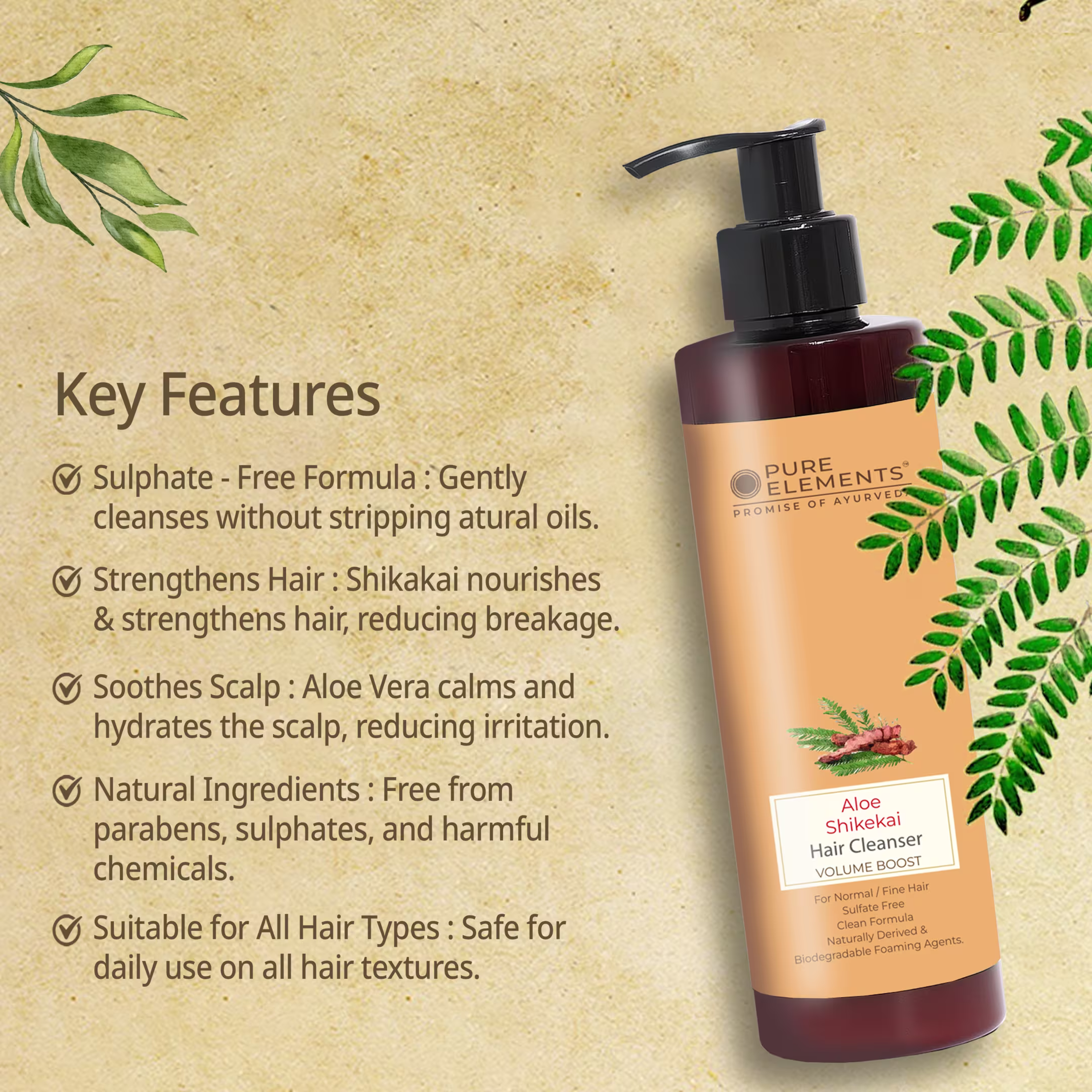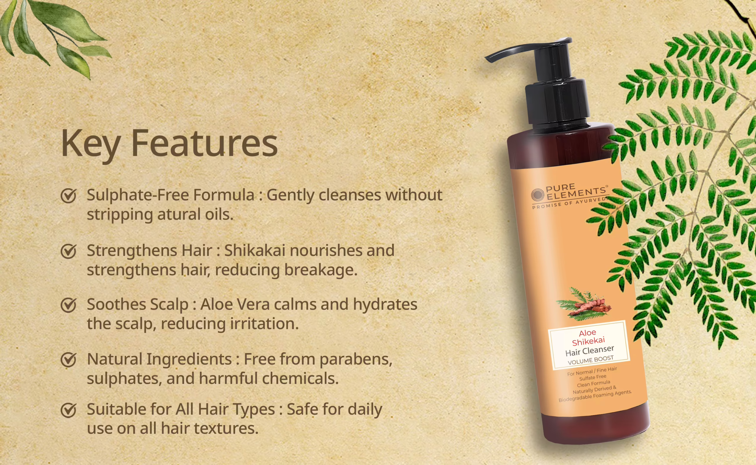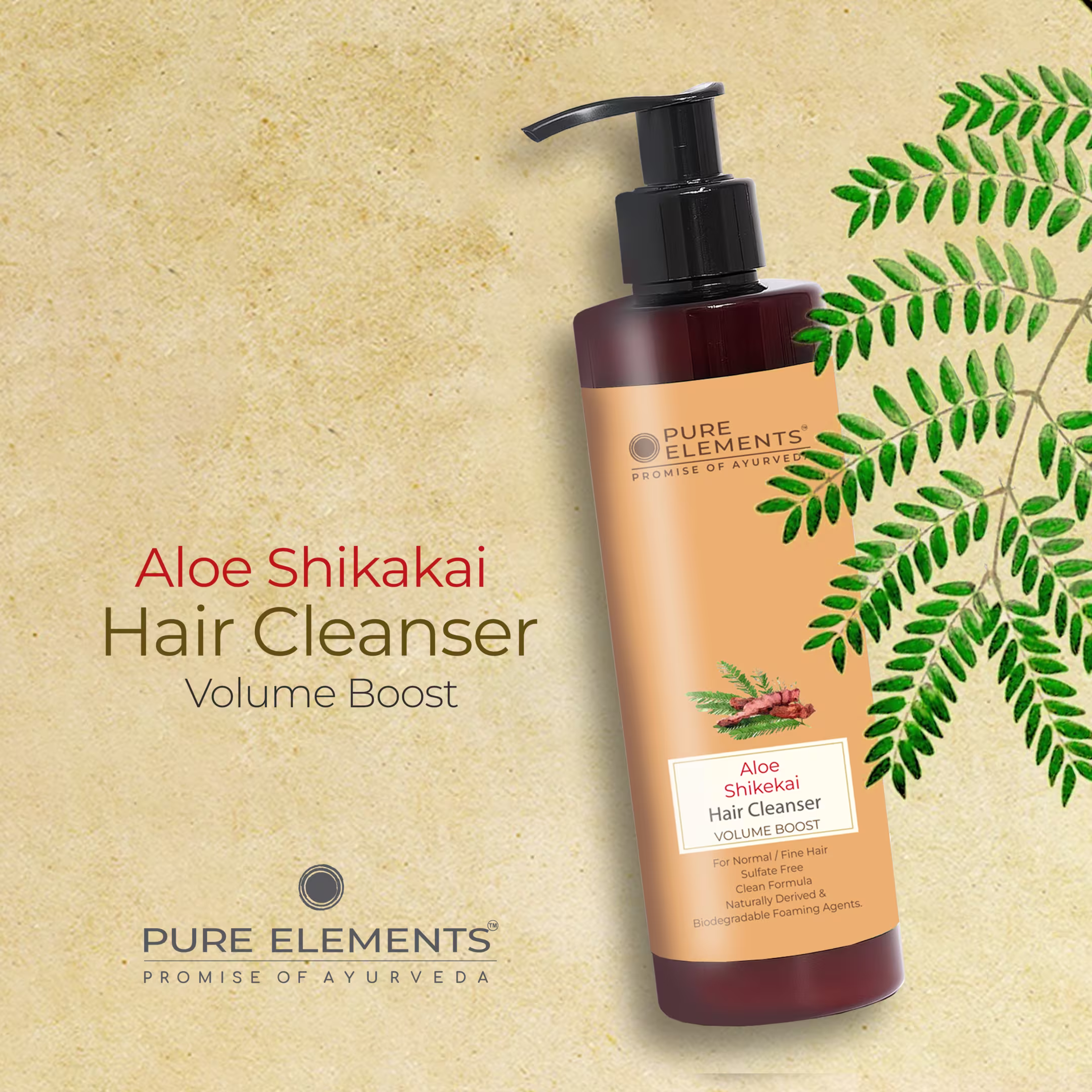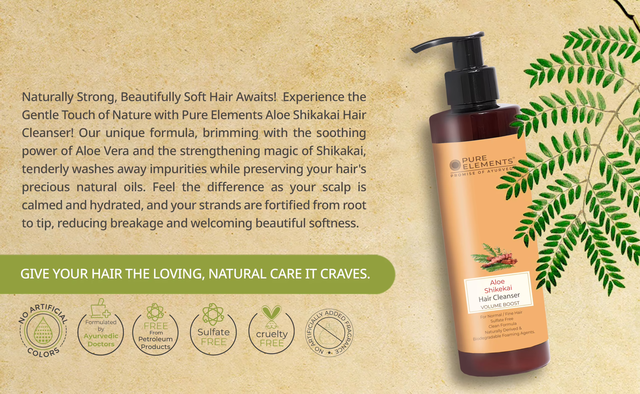 Pure Elements–Aloe Shikekai Hair Cleanser is an extremely mild scalp & hair cleanser formulated with naturally derived foaming agents. This shampoo is infused with Botanical Extracts, Proteins & Vitamins. It gently cleanses, repairs and moisturizes hair to make it healthier and softer. Carefully chosen ingredients like Aloe Vera, Shikekai, Reetha & Amla are proven natural hair cleansers. These are blended with Wheat Proteins and Vit B 5 to make hair shaft stronger. This shampoo made with natural ingredients is perfectly suitable for colored and chemically treated hair also. It delays fading out of colour and retains its depth for longer period. Made with Natural Foaming Agents. Free from Sulfates and Parabens. No added Color or Fragrance