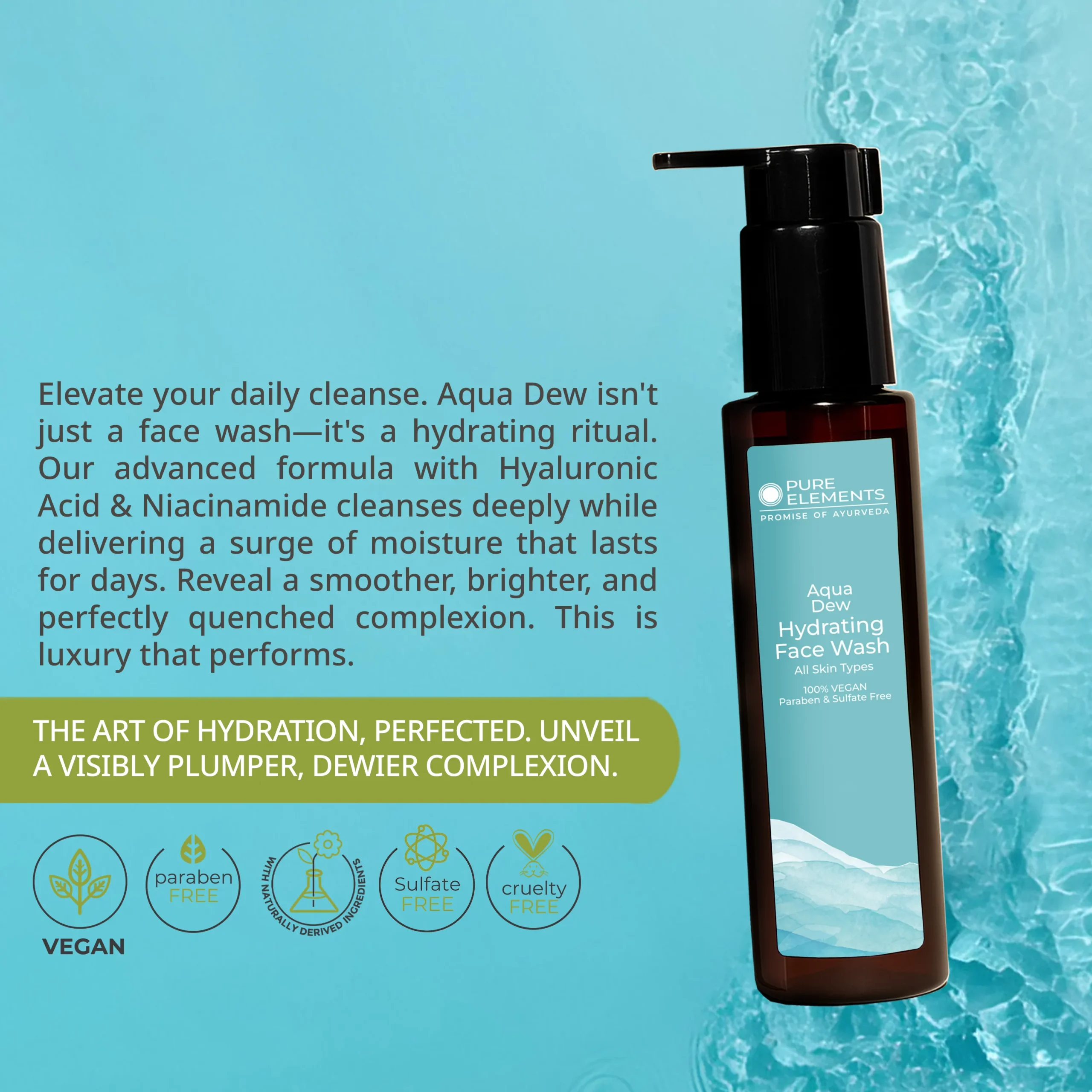 Immerse yourself in pure hydration with Pure Elements Aqua Dew Face Wash. This refreshing sulfate-free cleanser transforms your daily routine into a sensorial escape with its signature crisp, aquatic aroma. Powered by Aloe Vera Juice, Cucumber, and Lotus Flower, it gently purifies while flooding skin with moisture. Licorice, Manjistha, and Green Tea clarify and brighten. Essential oils of Vetiver, Lemon, and Bergamot awaken your senses and invigorate your complexion.