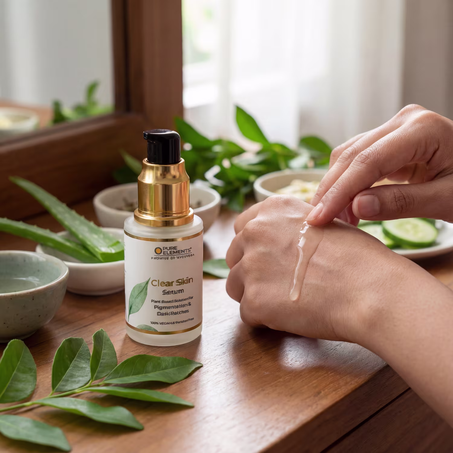 2. Take 2-3 drops of Pure Elements Clear Skin Anti-Pigmentation Serum and gently massage it onto your face and neck.