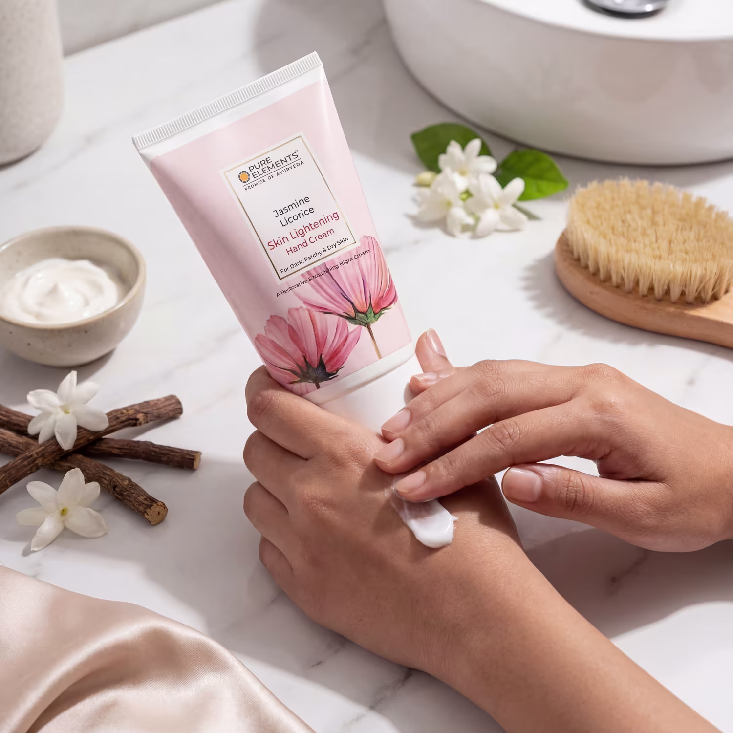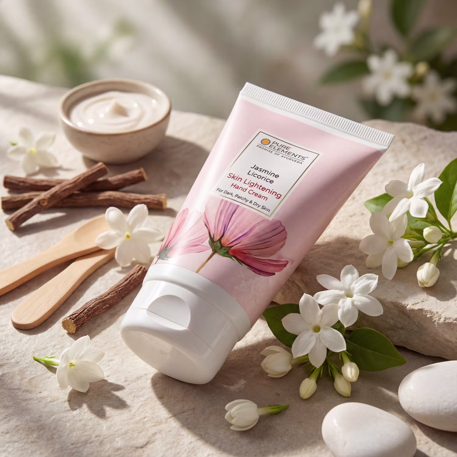 Kokum Butter, Shea Butter, Cocoa Butter, Cold Pressed Almond Oil, Cold Pressed Sesame Oil, Vit E, Vit C, Extracts of Organically derived Licorice & Anantmul (Hemisdesmus Indicus), Pure Essential Oil of Jasmine Flowers.