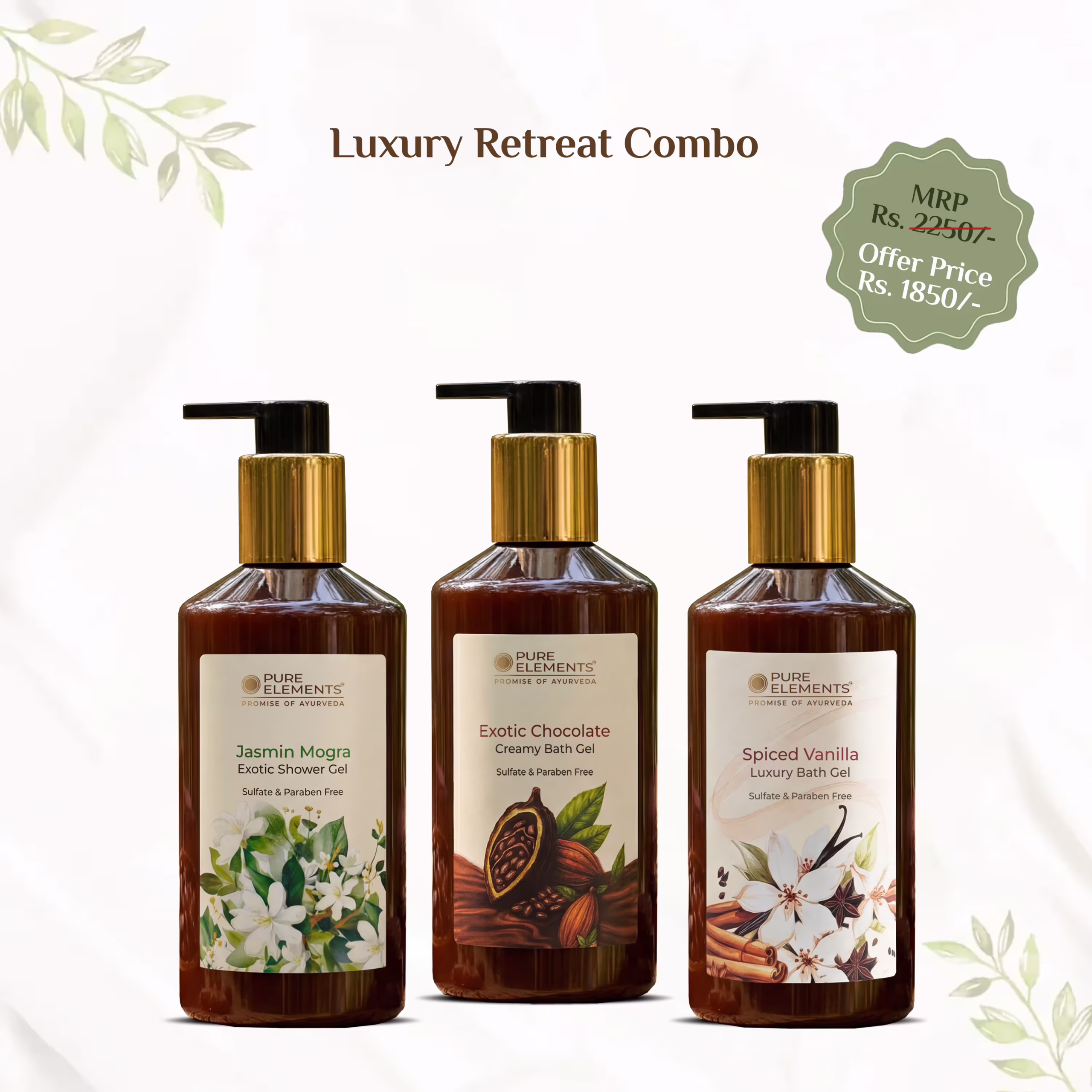 Turn your bathroom into a personal spa with Pure Elements’ Luxury Retreat Combo. This indulgent trio of bath and shower gels is crafted to pamper your skin and soothe your senses, bringing the essence of Ayurveda into your daily routine.