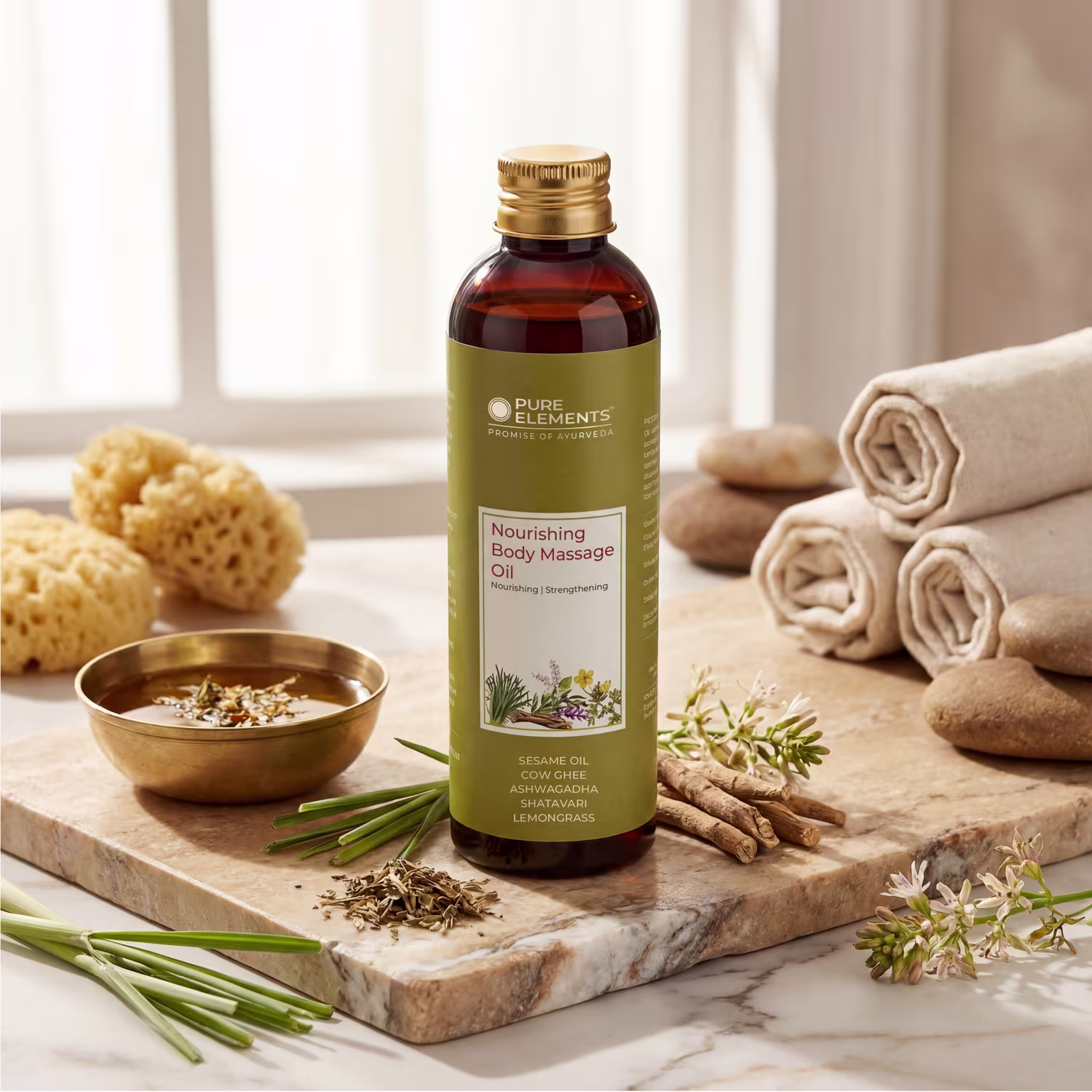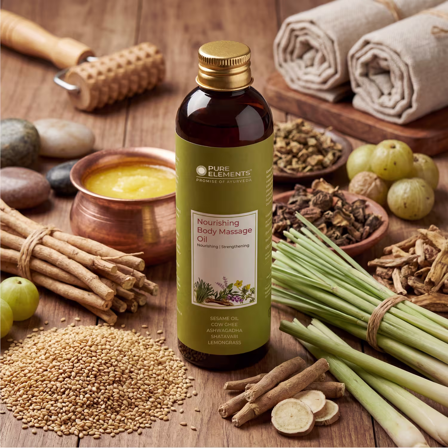 Pure Elements – Nourishing Body Massage Oil is a rich blend of Sesame Oil and Pure Cow Ghee, processed with some essential herbs mentioned in Ayurvedic texts. This oil is enriched with herbs like Ashwagandha and Shatavari which are known for their muscle toning effects since centuries. Yashtimadhu and Manjishtha improve skin complexion while Ginger and Lemongrass exert their relaxing effect on muscles.Increases blood circulation and makes skin softer. An absolutely natural product. Free from Mineral Oil, Silicone and Paraffin Oil.