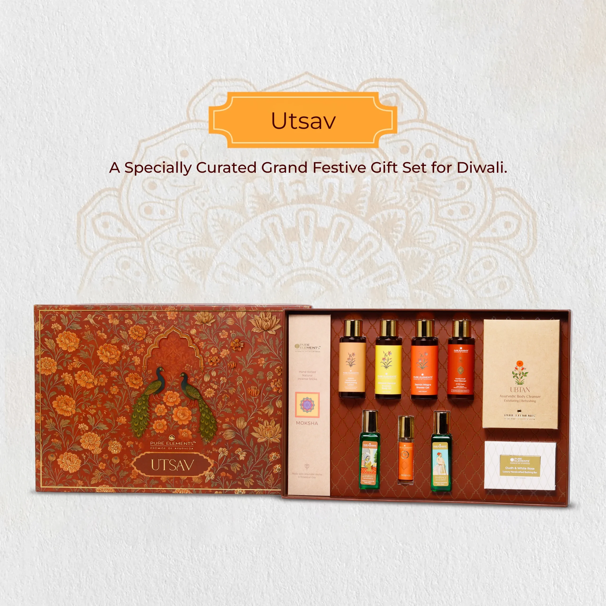 The PURE ELEMENTS Utsav Gift Box is a curated collection designed to transform your daily self-care routine into an extraordinary ritual. This luxurious set features eight unique products, each meticulously crafted to nourish your skin and captivate your senses with enchanting aromas.